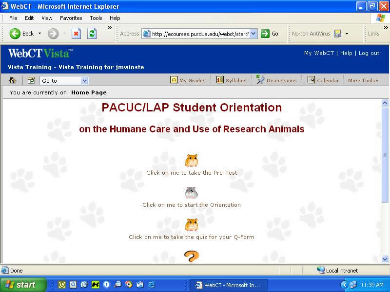 For my first prototype, I simply reworked the current online instruction a bit, customizing the content to the undergrads as directed by the PACUC administrator. In this round I simply tried to familiarize myself with the content and structure of the material. Was it organized logically and optimally? I also looked at motivational issues, and tried to apply some recommendations for the design of online instruction - namely developing interactivity, student control, and 'instructional immediacy.' PACUC's current online instruction was linear and consisted of some 30 slides. By adding a course map, I gave the students the option of navigating the instruction in other ways and of starting and stopping when they wanted to. I also used multimedia to enhance 'instructional immediacy.' Thoughtfully designed courseware (sometimes using JavaScript and Java) can somewhat make up for the loss of the instructor's 'personality' and nonverbal interaction with the instructor and one's peers. I tried to get at the ethical and attitudinal components of the instruction by 'giving the animals a voice' through image and multimedia. PACUC folk often make the observation that the animals cannot speak for themselves, so I tried to find ways in the instruction to remind students through images and multimedia that animals were living beings perhaps in some ways not too unlike themselves. I put this version on my Purdue Career Account website and emailed instructions to the PACUC education subcommittee on how to access it. The committee had mixed reactions to the graphics and other experimental changes to their instruction. However I felt the initial prototype also accomplished its purpose by assisting the committee to recognize and arrive at a more optimal organization of content for undergraduate students. The committee and the administrator and I met at least two more times to talk about changes. We trimmed the instruction to just 17 slides and tightened up the organization and presentation of various concepts. During this period the opportunity opened up to put the instruction on the University's WEBCT platform. There were several advantages to this - WebCT offered the committee a secure platform, and was also a familiar learning and teaching environment to many students and professors at Purdue. Access was available both on and off campus. WebCT offered the advantage of automatic grading and notification, and it also put complete control of the instruction into the hands of PACUC and LAP (whereas the current website did not). Purdue's WebCT team met with the educational sub-committee and me on more than one occasion to assist in the process of getting us access to WebCT. Consequently July 2003 I attended several training classes for a new version of WebCT called Vista that Purdue was rolling out for fall 2003. Shortly thereafter I put the revised prototype on Vista, requested accounts, and emailed a brief tutorial to the PACUC educational subcommittee on how to access the instruction. This time, I introduced a brief ethical dilemma scenario as recommended by the literature for teaching ethics and critical thinking. This was something totally new to PACUC's training. I also tried to deal with issues of accessibility in the second prototype, being careful to use HTML that would make sense to those viewing the training in aural and non-visual channels: